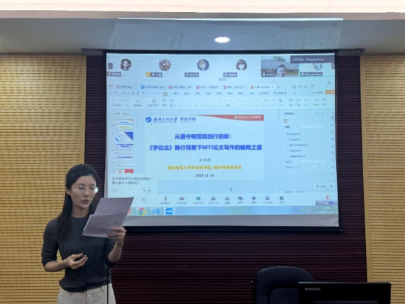 在内容讲解中,余教授结合自身丰富的科研经历与指导经验,从选题逻辑、实践语料构建、理论框架建立到案例分析方法,逐步讲解MTI论文写作的关键环节,帮助员工厘清论文写作中的痛点与堵点。整个报告内容深入浅出、结构清晰,为MTI研究生明确了从规范迈向创新的可行路径。