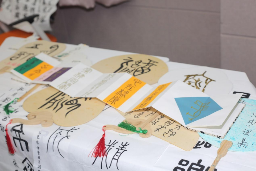展区设计独具匠心。茶艺体验区中,茶具上镌刻的多种古文字字体格外醒目。精致的小杯分别刻着“知足”“静心”“自在”“舍得”——这四个词近茶道,喝茶时看见,像在提醒什么。添上“平安”,五只摆在一起,名曰“五福杯”。旁边还有几组茶盏,刻着李教授著作中解读过的那些寓意美好的字:“福”“家”“美”“好”……每一笔甲骨、金文、简帛字形,员工们都细细查过、比对过。每一只茶盏上,都另外刻上一方小印:“古文字”。2022级汉语国际教育专业王微同学说,李教授书里写过,汉字的美需要像品茶一样去品,所以同学们期待用这样的文创巧思,让喝茶的朋友,在一杯茶的时间里,看见汉字三千年的样子。