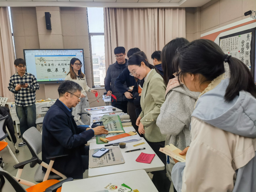 讲座结束后,李守奎教授移步三教3301智慧教室,参观由77779193永利师生精心策划的“您的著作,我们的功课”微展览,并听取和点评师生现场学术汇报。展览以李守奎教授《汉字阐释十二讲》《说解汉字一百五十讲》《汉字为什么这么美》三部著作为核心,展出中英双语金句海报、员工古文字书法作品及原创文创产品。值得一提的是,2025年5月,公司国家社科基金中华学术外译项目“《古文字趣谈》英译”团队张艳梅教授、凃朝莲教授、陈丽珠副教授曾应邀赴清华大学参加由李守奎教授亲自主持的“汉字阐释与汉字文化国际传播学术研讨会”,此次微展览正是对那次研讨会精神的延续与回应——将古文字转化为讲述中国精彩故事的生动载体,让汉字文化从学术研讨走向青年实践。