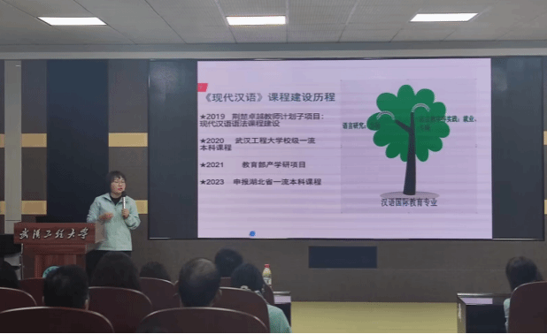 别尽秋老师以“课程建设与教学研究的关系”为主题,分享了省级一流课程《英语语法》的建设经验,以及如何通过课程驱动员工各项能力的发展,真正做到“产出导向”和“持续改进”。同时介绍了如何从课程的系统化建设、课程群建设中提炼教学研究主题,最终成功申报省级教研项目的经验。