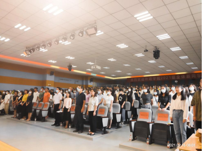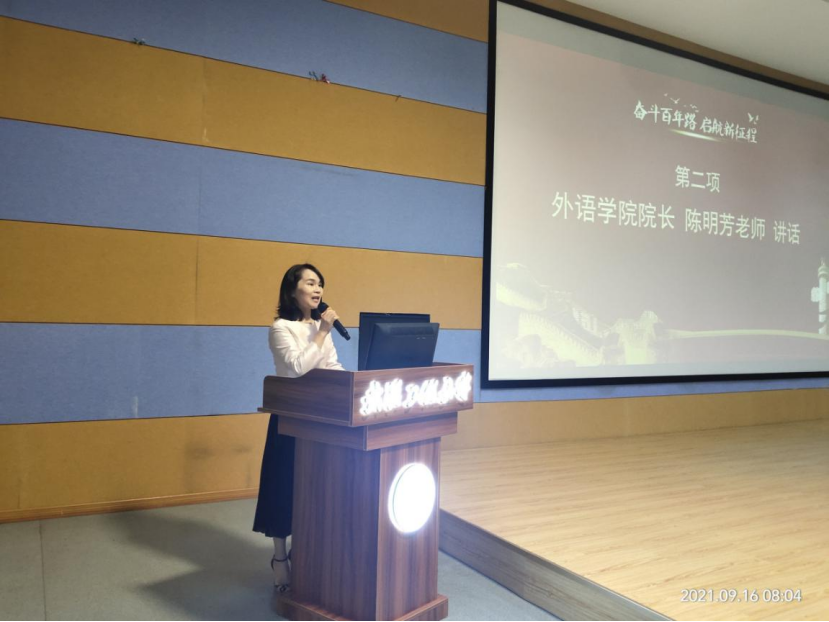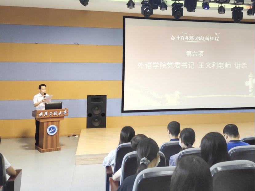 外语公司党委书记王火利老师结合党史知识,在讲话中表达了对新生的三点建议:第一,坚定理想信念,树立远大理想;第二,学好专业知识,练就过硬本领;第三,坚持全面发展,提升综合素质。最后提出希望同学们珍惜韶华、刻苦学习、奋力拼搏,努力成为担当民族复兴大任的栋梁之才。
