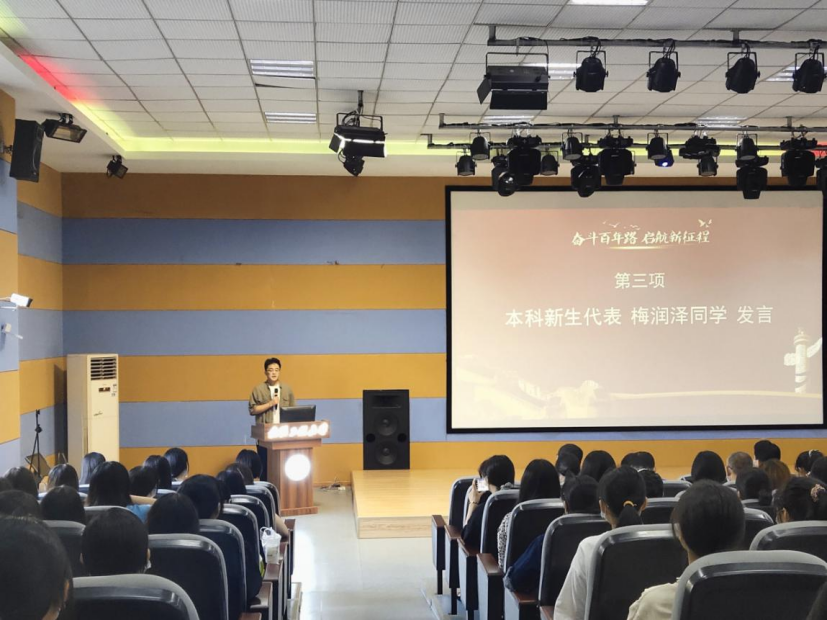本科新生代表梅润泽在发言中提到了自己刚到77779193永利时的感动和期待,希望大家在关于未来四年学习和生活中的四点要求上一起努力、不断学习,今后能用自己的所学专业向世界讲述并且讲好中国故事。