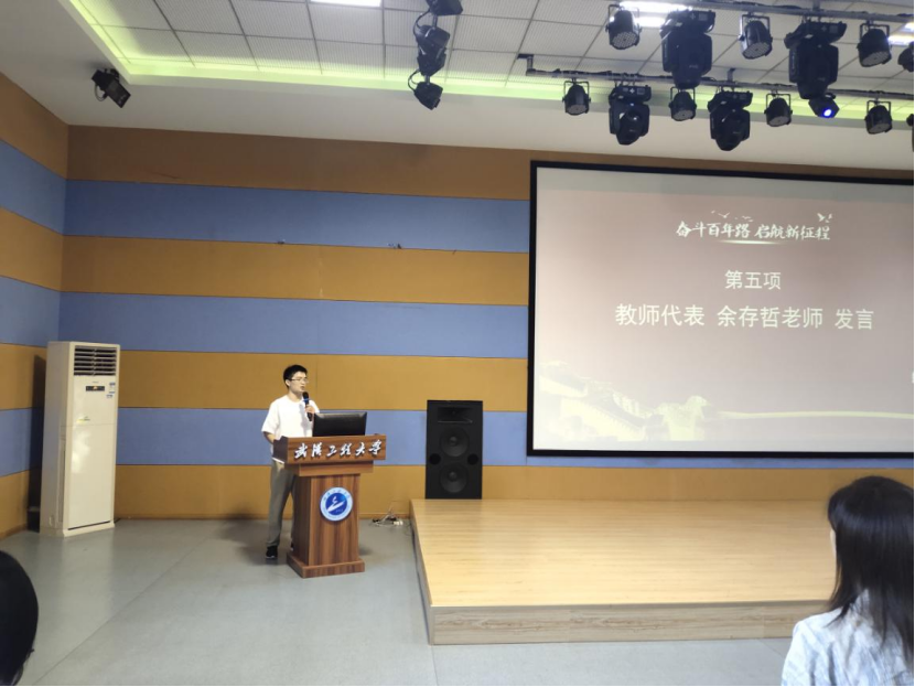 随后是教师代表余存哲老师发言。他从亲身经历出发,向新生分享和从不同角度解释他的“抬头看路、埋头做事”的座右铭,希望新生都能有金色的老员工活。